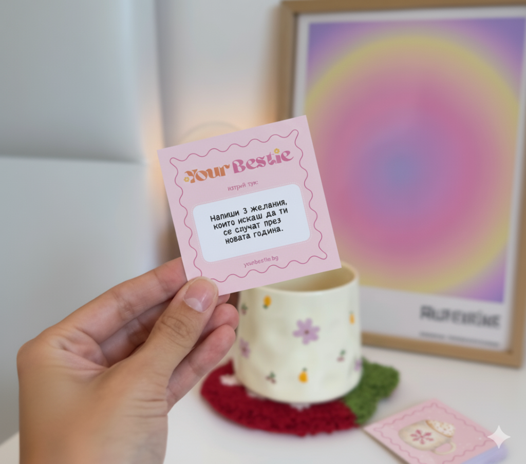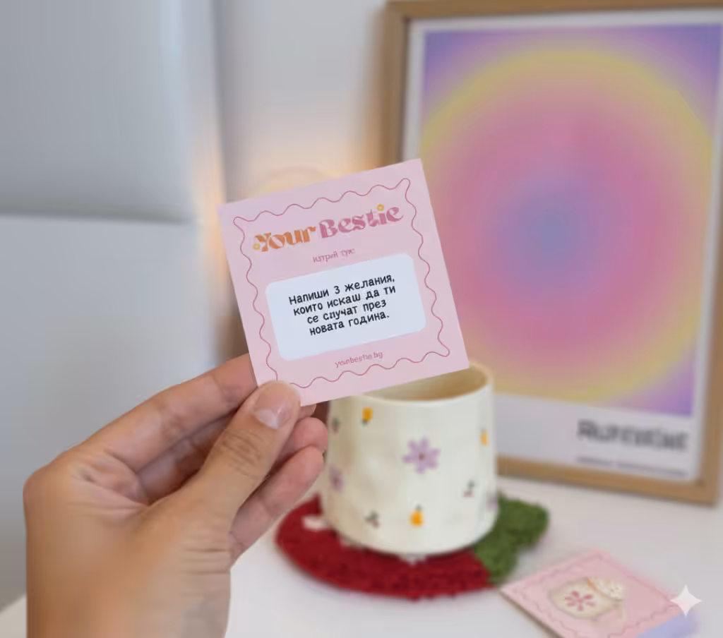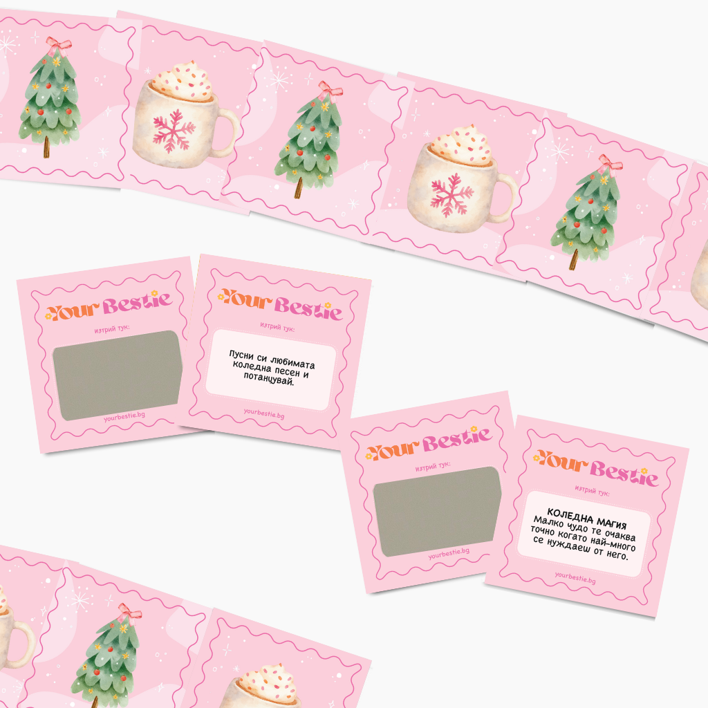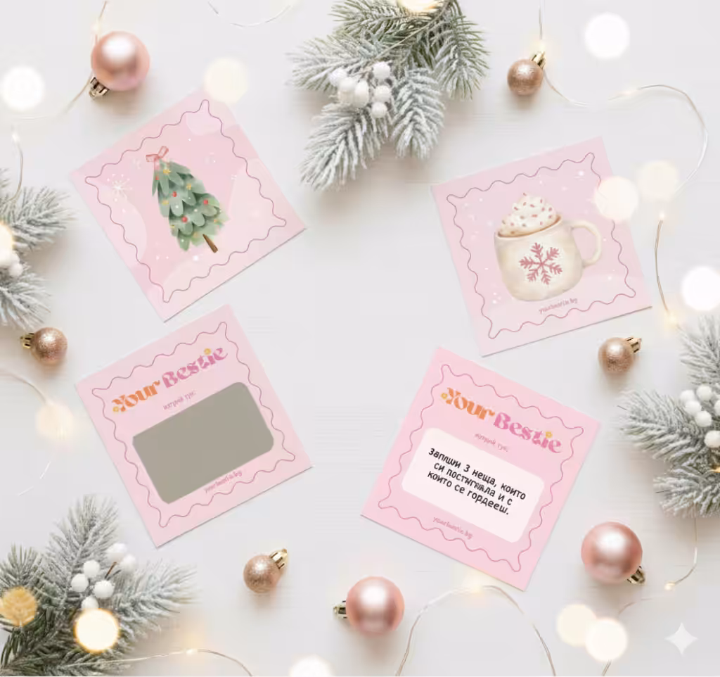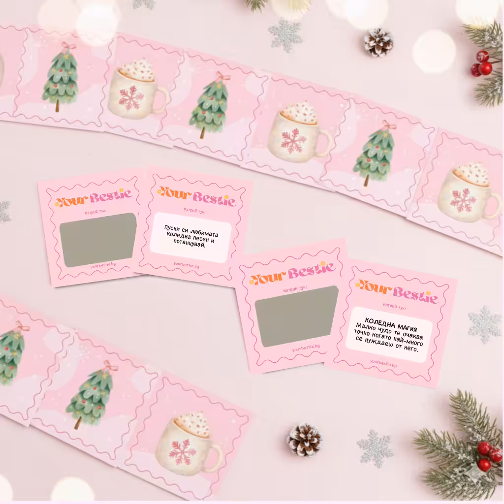 30 коледни вдъхновяващи послания и предизвикателства, които ще направят дните ти по-смислени, усмихнати и вълшебни. Всяко късметче носи частичка от коледната магия и топлината на Your Bestie.