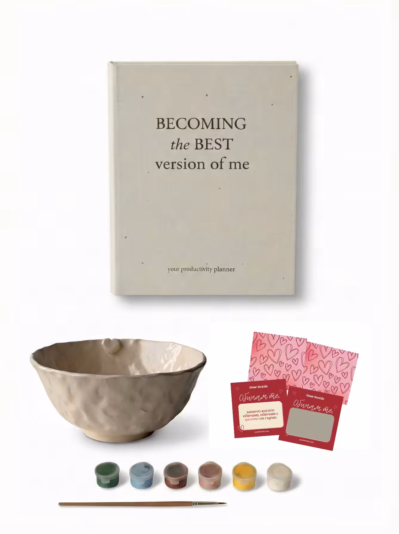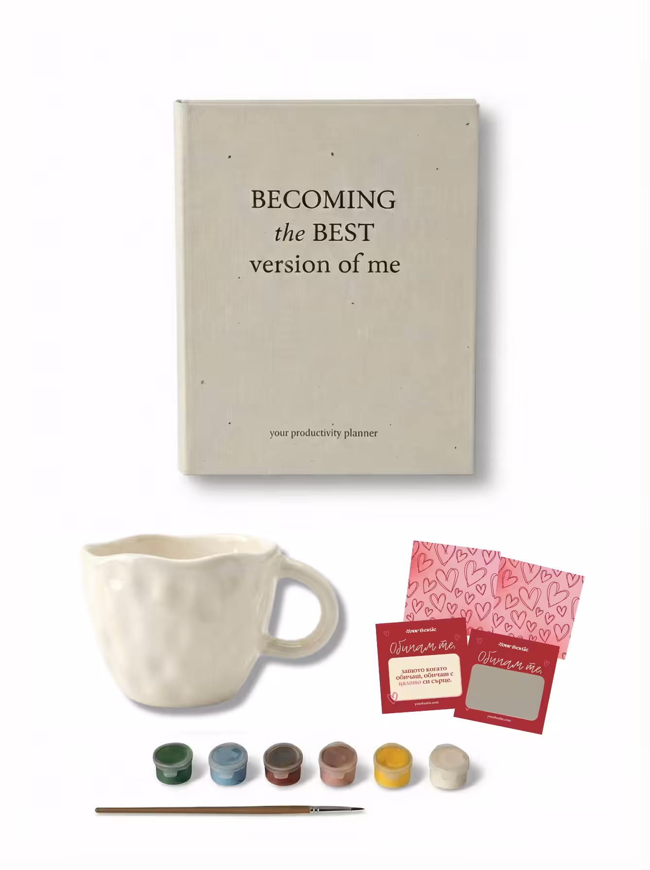 Your Bestie керамичен продукт по избор - Можеш да избереш между ръчно изработена чаша за капучино, еспресо чаша или купичка за закуска, всяка от които може да бъде нарисувана по твой уникален начин с включените боички и четка. Създай своя уникален дизайн – различен, красив и пълен с емоция.