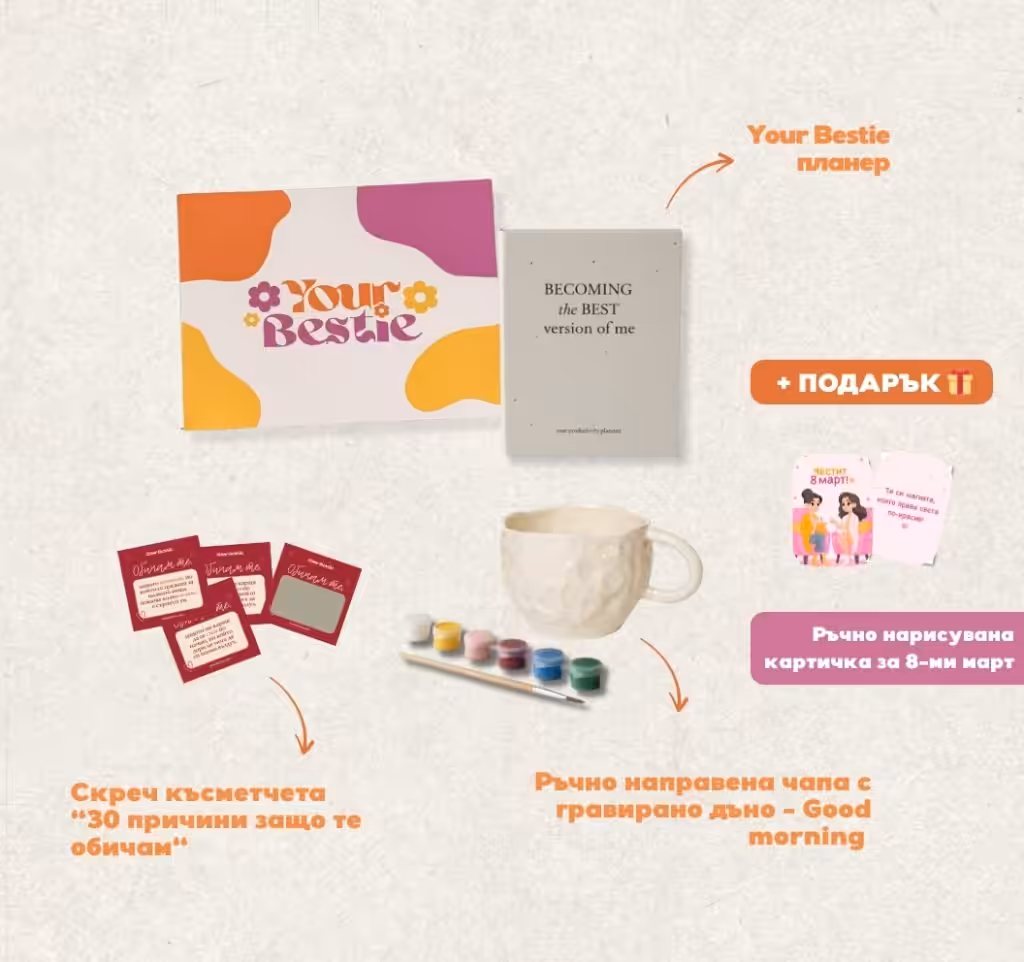 “Когато търся подарък, винаги искам да е нещо повече от просто предмет, а да има преживяване. Точно това открих в тази кутия. Приятелката ми си нарисува чашата и оттогава това е нейната най-любима. Всяка сутрин си търка по едно късметче, пие кафето си от чашата, а изненадващото е, че всеки ден използва и планера. Стана си нейното малко време за себе си.”